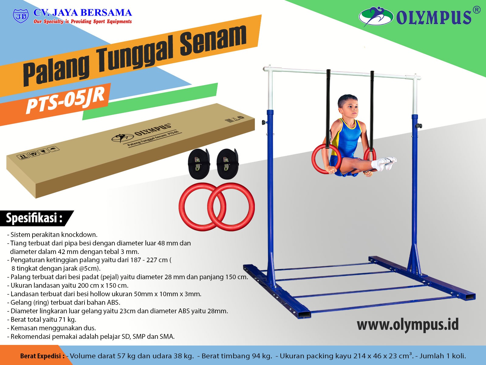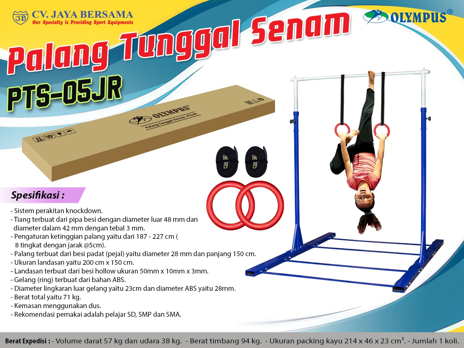 Spesifikasi Palang Tunggal Senam PTS-05JR (Junior Horizontal Bar) merek Olympus sebagai berikut :