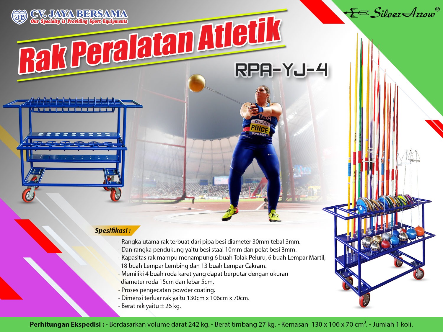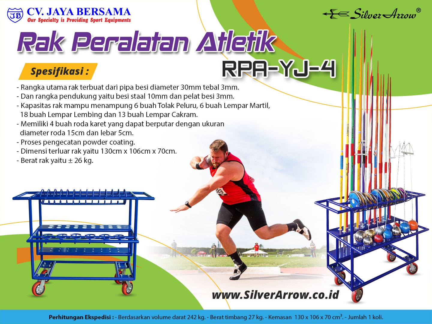 Spesifikasi Rak Peralatan Atletik RPA-YJ-4 (Athletic Equipment Rack) merek Silver Arrow sebagai berikut :