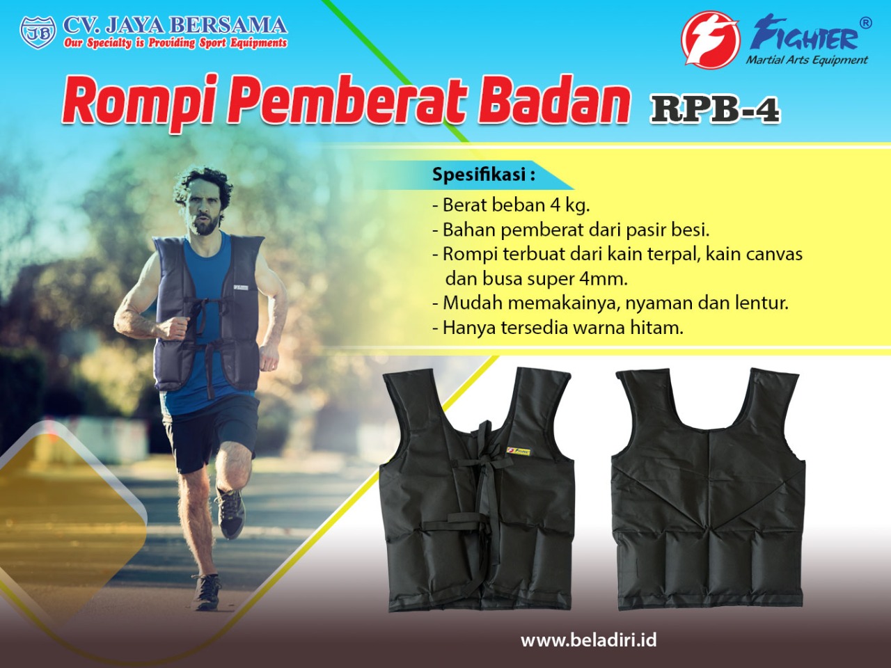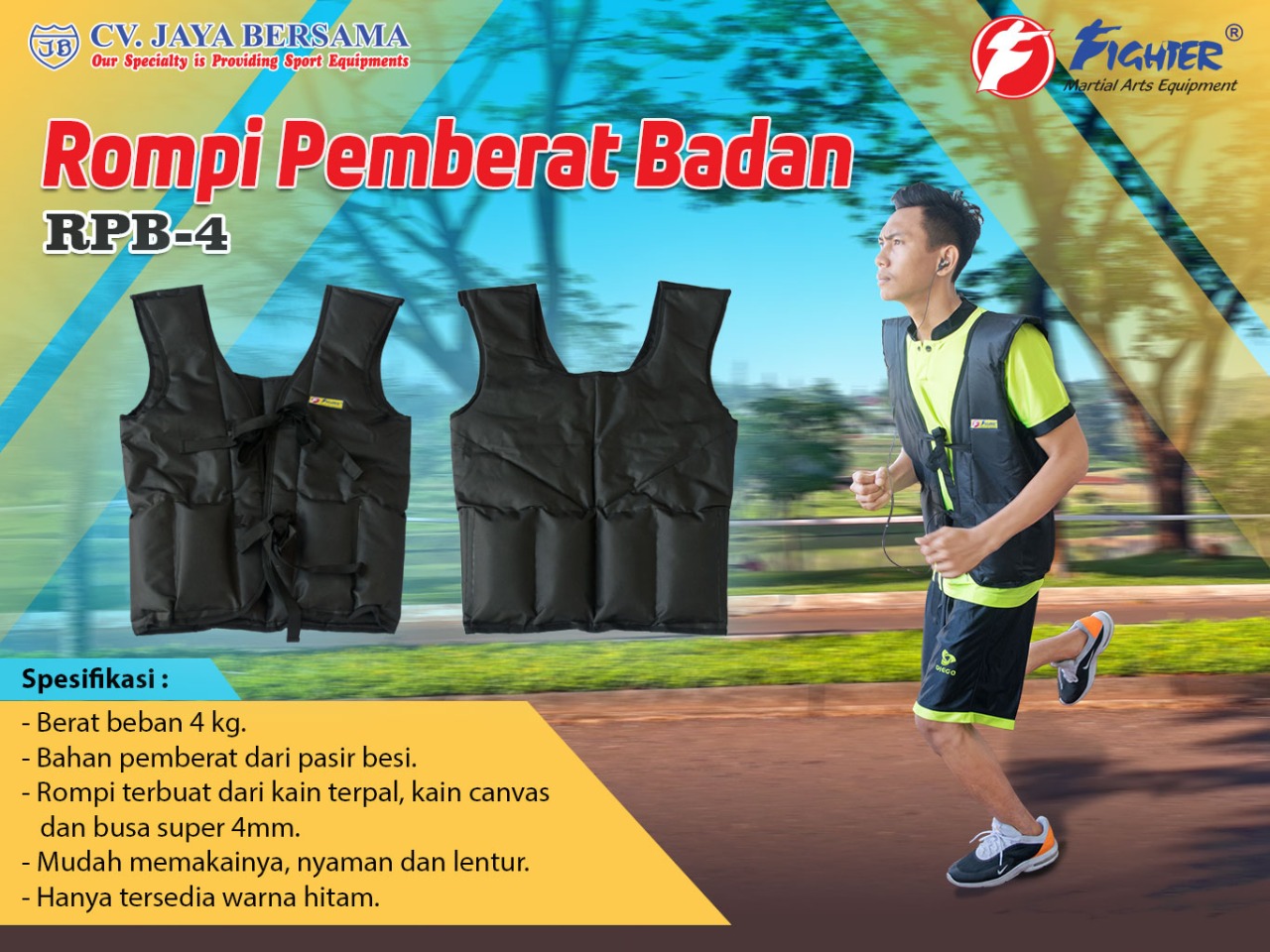 Spesifikasi Rompi Pemberat Badan 4kg RPB-4 merek Fighter sebagai berikut :