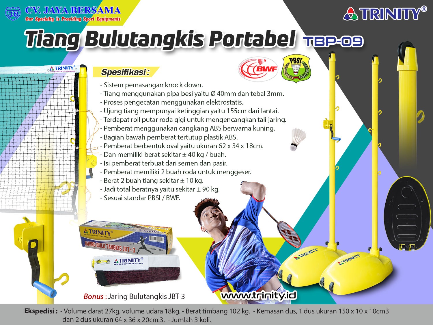 Spesifikasi Tiang Bulutangkis Portabel TBP-09 merek Trinity sebagai berikut :